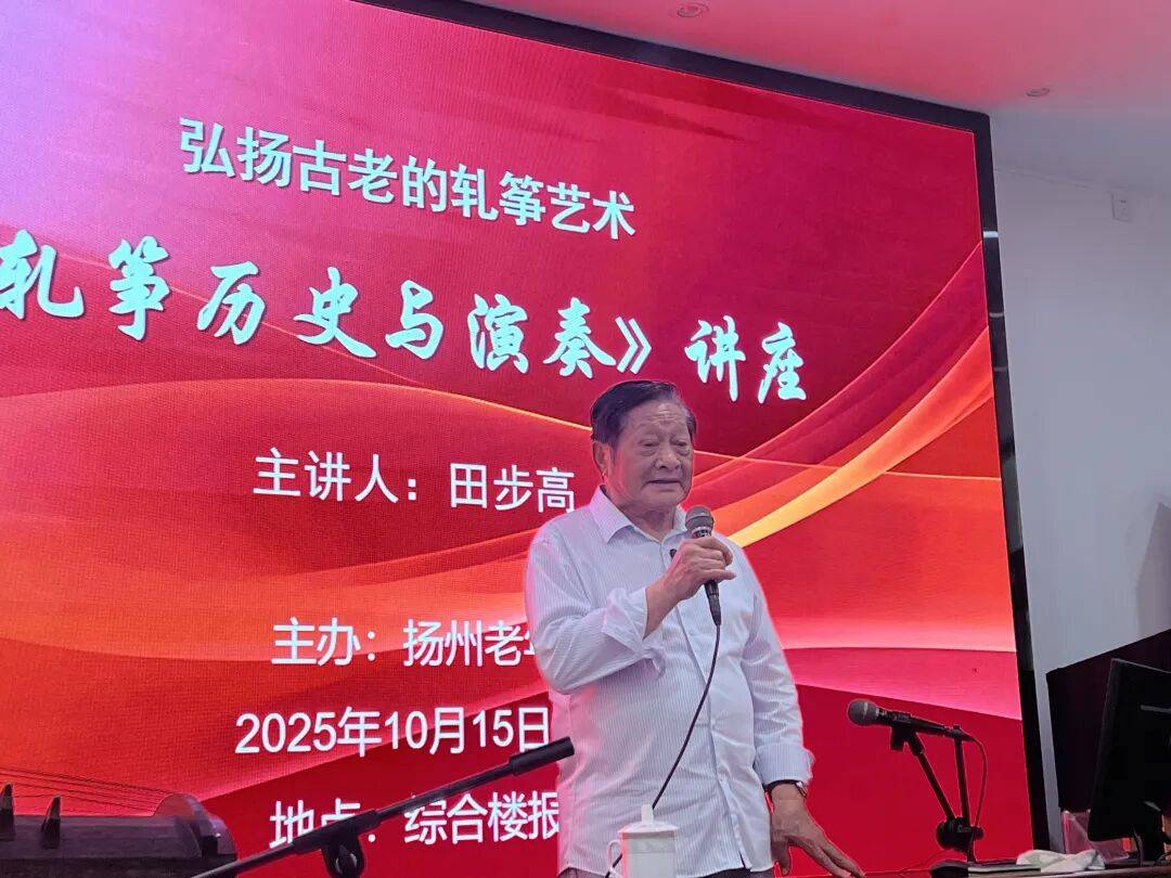 2025 年 10 月 15 日,扬州老年大学综合楼报告厅座无虚席,《轧筝历史与演奏》专题讲座在此温情开讲。本次讲座由扬州老年大学主办,文化部非物质文化遗产保护工作先进个人,龙凤乐器创始人田步高老师受邀担任主讲,田老师也是扬州老年大学古筝班首位任教者。这次讲座旨在弘扬古老轧筝艺术,为中老年学员打开了解传统乐器的新窗口。